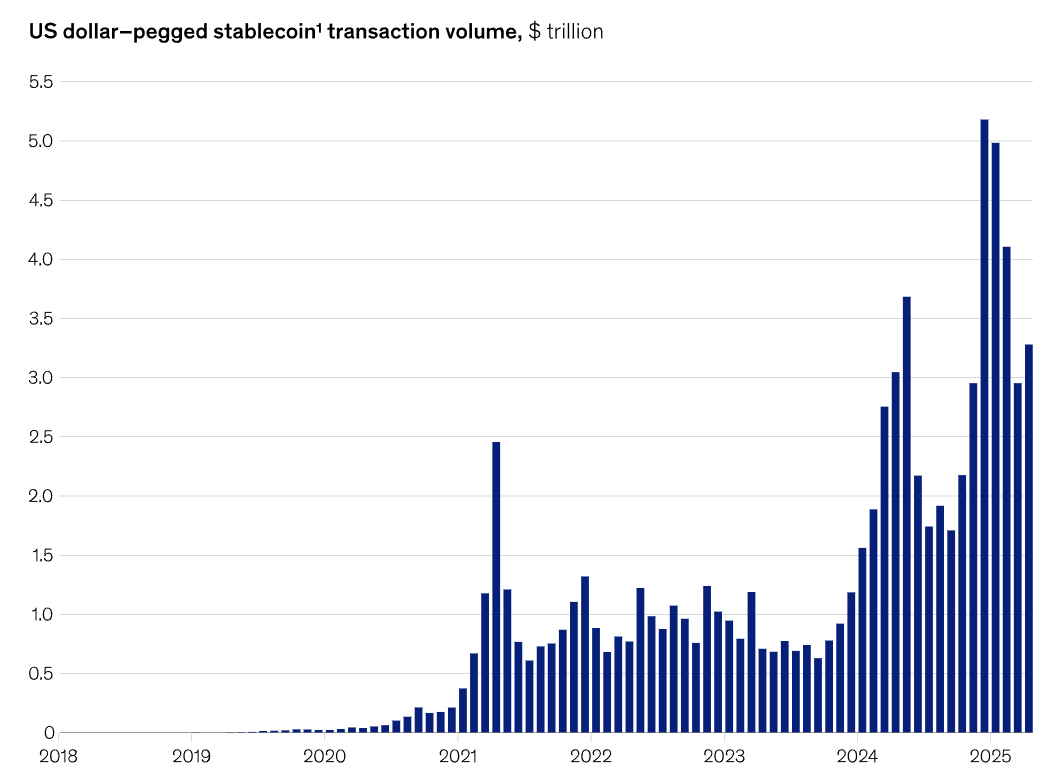 From January to July 2025, transaction volume, that is, the total amount of money moved using stablecoins, rose 83% compared to last year, reaching over five trillion dollars. Some of this activity comes from computers automatically trading back and forth extremely fast, but even if you remove that, regular everyday use still adds up to about one trillion dollars — more than double last year.