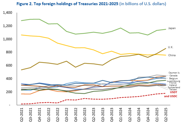 Stablecoins aren’t just popular with users but are also becoming deeply connected to other parts of the macroeconomy, especially the US government debt (Treasury) market. Companies that issue major stablecoins, like Tether and Circle, keep back over 80% of their reserves with short-term US Treasuries, becoming critical buyers of US government bonds. By the end of 2024, Tether alone owned about $94.5 billion worth of US Treasuries, which is close to 1% of all US debt held by foreign countries. From early 2024 to early 2025, stablecoins as a whole became the third-largest buyers of US Treasuries, with only the Cayman Islands and Belgium buying more. If stablecoin growth continues, they could soon become a key source of funding for the US government. Stablecoin issuers' role in the US Treasury market means stablecoins are gaining more legitimacy and importance, thereby giving regulators, investors and financial institutions even more reason to support them as they continue to expand.