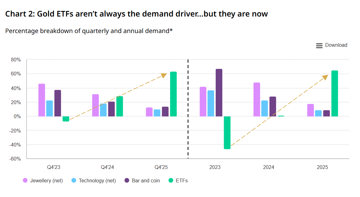 The gold industry is the surge in investment demand, particularly from exchange-traded funds (ETFs) and central banks. In 2025, total US gold demand rose to 679 tons. This was primarily composed of investment demand, especially physically backed gold ETFs. As investors navigated uncertainty (heightened geopolitical tensions and US dollar weakness), gold regained its role as a safe-haven asset and portfolio diversifier.